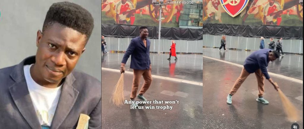 Remote, a popular Nigerian comedian and die-hard Arsenal fan, stirred outrage online after performing a dramatic spiritual stunt at London’s Emirates Stadium.