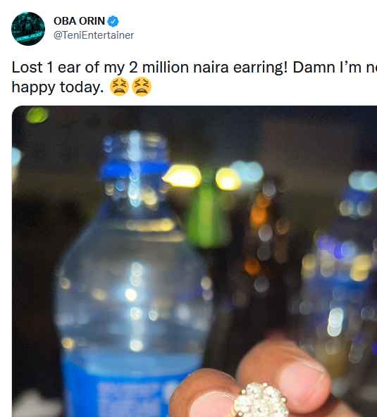 The Billionaire singer shared a photo of the one ear of her earring and then wrote: “Lost 1 ear of my 2 million naira earring! Damn I’m not happy today”.