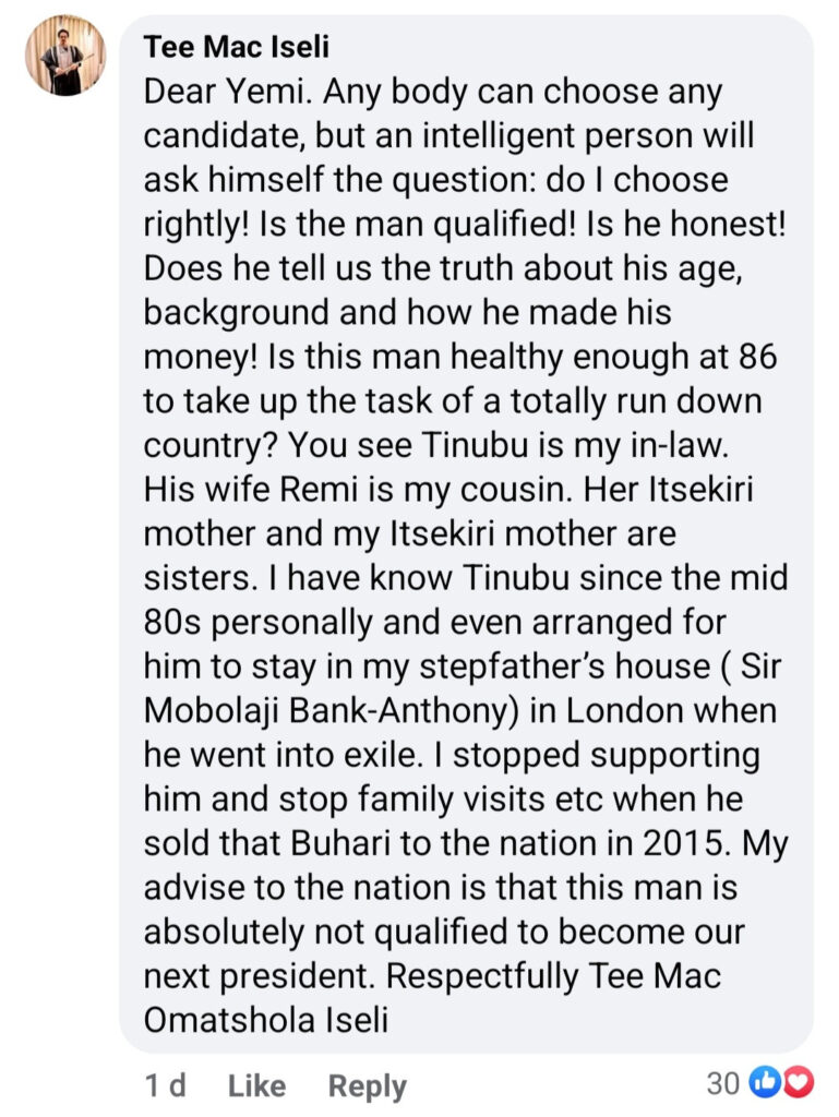 “I stopped supporting him and stop family visits etc when he sold that Buhari to the nation in 2015. My advise to the nation is that this man is absolutely not qualified to become our next president. Respectfully Tee Mac Omatshola Iseli.”