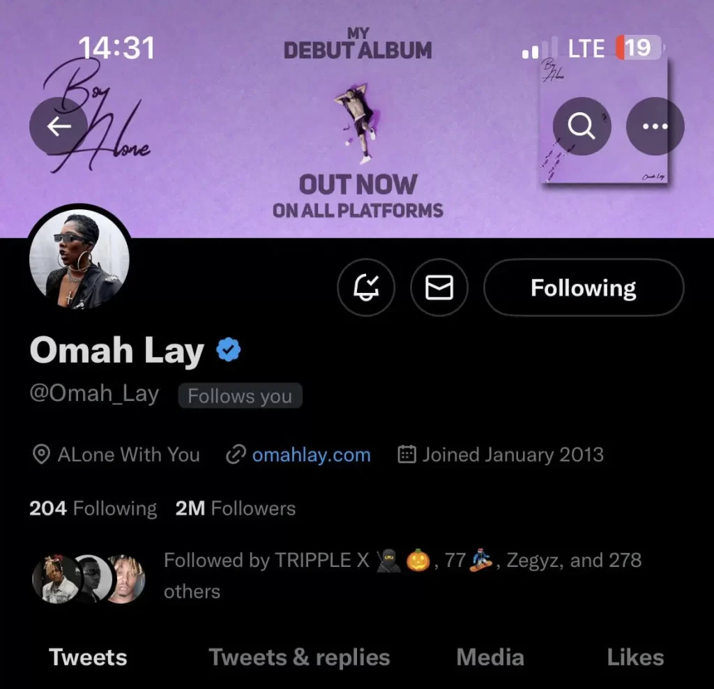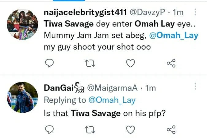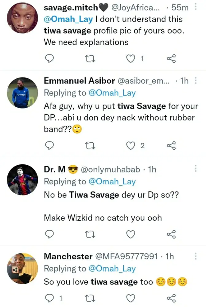 - Omah lay used a picture of Tiwa Savage, as his Twitter handle display picture.