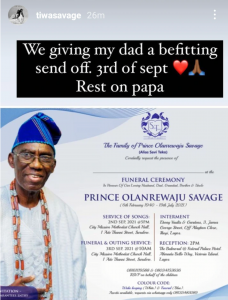 Tiwa Savage announced the death of her father on her Instagram page. She has also shared the invite of his burial on her Instagram story.