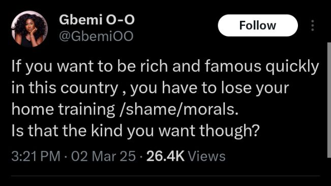 - In a tweet on Sunday, Gbemi expressed her sadness that people feel they must compromise their morals to succeed quickly.