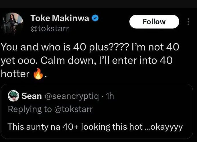 She wrote: “You and who is 40 plus???? I’m not 40 yet ooo. Calm down, I’ll enter into 40 hotter 🔥.”