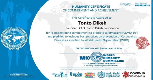The Nollywood actress took to her Instagram page to announce the recent awards she has received from the organization. The World Humanity Commission award the actress for demonstrating commitment to promote safety against the COVID-19. The certificate also indicated that Tonto was awarded for pledging to include best practices on the prevent of the Coronavirus disease as directed by the World Health Organisation (WHO).