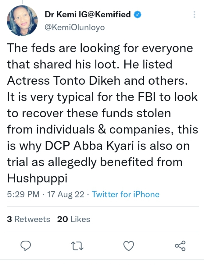 “The feds are looking for everyone that shared his loot. He listed Actress Tonto Dikeh and others. It is very typical for the FBl to look to recover these funds stolen from individuals & companies, this is why DCP Abba Kyari is also on trial as allegedly benefited from Hushpuppi”