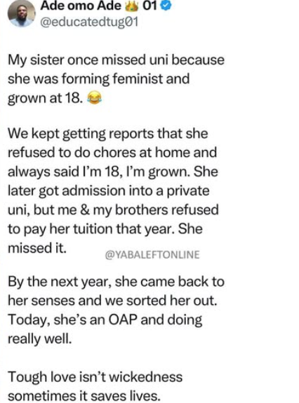 Taking to X, Ade revealed that his sister once missed out on gaining admission into the university because she insisted she was “grown” at 18 and refused to do chores at home. According to him, the family kept receiving complaints that she would always say, “I’m 18, I’m grown,” whenever she was asked to contribute to housework.
