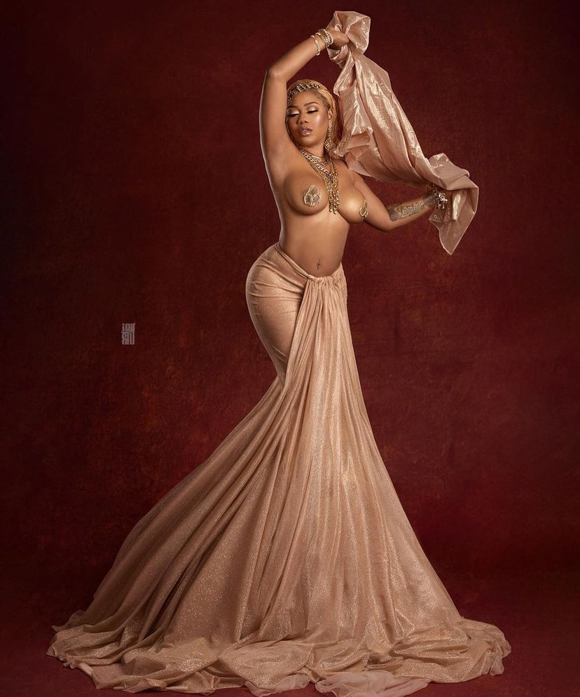 Toyin shared pictures from her semi-nude shoot in which she covered herself from the waist down but left her upper body bare on her Instagram page.