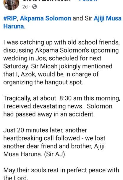 Azok recounted a lighthearted moment when another friend had playfully suggested that he should organize a pre-wedding celebration for Solomon. However, his happiness swiftly turned to despair upon receiving the tragic news of Solomon’s death. His sorrow deepened shortly thereafter, as he learned of the passing of another cherished friend, Ajiji Musa Haruna, affectionately known as “Sir AJ.”