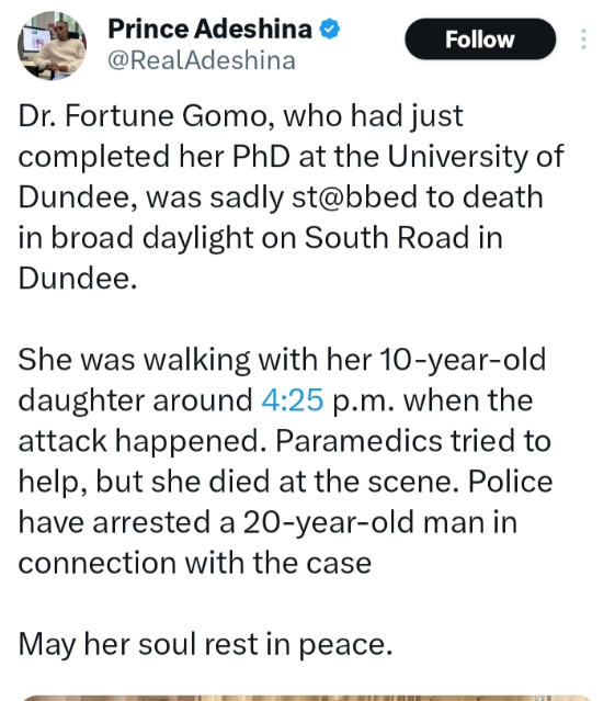 According to reports shared by a netizen identified as Prince Adeshina, the tragic incident occurred in Dundee, Scotland, where Fortune was allegedly stabbed to death by a 20-year-old man who was out walking his dog.