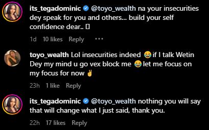 In response, Tega affirmed: “@toyo_wealth na your insecurities dey speak for you and others… build your self confidence dear.. 🫂”