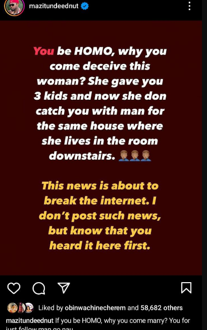 Renowned blogger and performer Tunde Ednut, along with other celebrities, are now creating a stir on the internet with indications regarding a celebrity guy with three children who was discovered by his wife having sex with another man in their home.