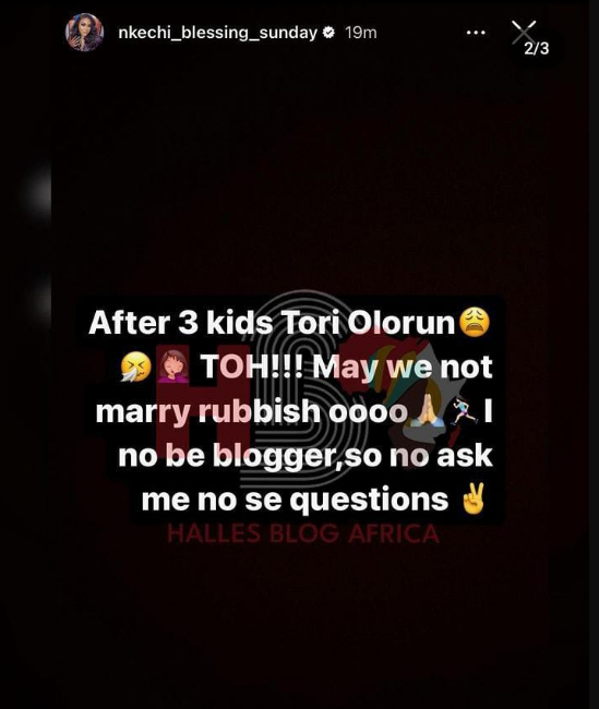 “After 3 kids Tori Olorun TOH!!! May we not marry rubbish oooo I no be blogger,so no ask me no se questions.
