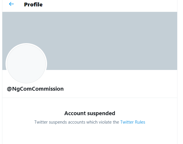 The Nigerian Communications Commission (NCC) account has been suspended on Twitter.