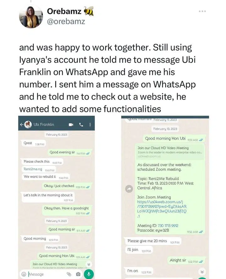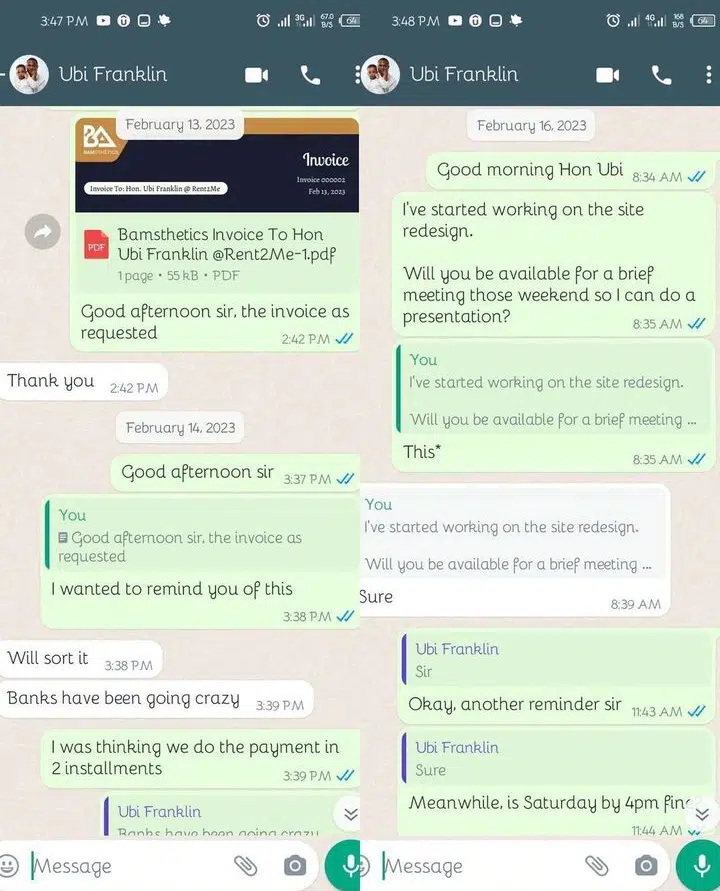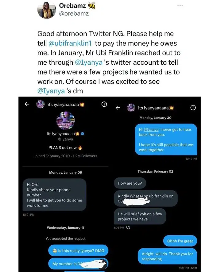 “Good afternoon Twitter NG. Please help me tell @ubifranklin1 to pay the money he owes me. In January, Mr Ubi Franklin reached out to me through @Iyanya ‘s twitter account to tell me there were a few projects he wanted us to work on. Of course I was excited to see @Iyanya ‘s dm and was happy to work together. Still using Iyanya’s account he told me to message Ubi Franklin on WhatsApp and gave me his number.“I sent him a message on WhatsApp and he told me to check out a website, he wanted to add some functionalities.