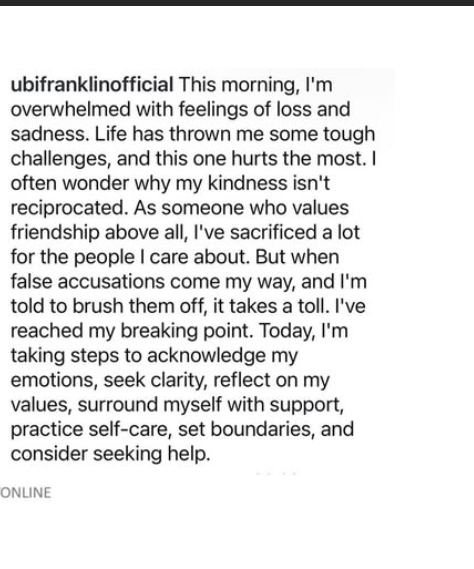 - Music executive Ubi Franklin shared that he’s been battling feelings of loss and sadness, saying unreciprocated kindness and false accusations have taken a toll, and he’s now prioritising self-care and emotional healing.