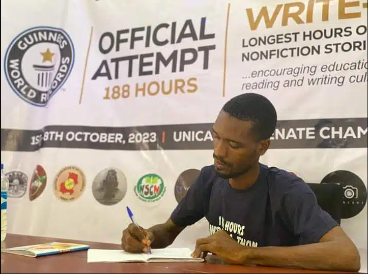 Daniel Ehis Aiguokhian, a student at UNICAL, starts a write-a-thon to break the record for the longest continuous writing session, which is 188 hours.