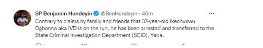 “Contrary to claims by family and friends that 37-year-old Ikechukwu Ogbonna aka IVD is on the run, he has been arrested and transferred to the State Criminal Investigation Department (SCID), Yaba.”he tweeted