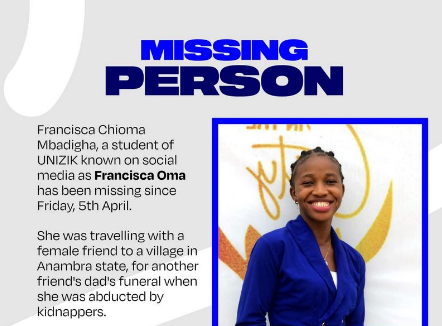The post on social media by one Collins C. was captioned, “Francisca Oma Went Missing!” and it reads, “She was abducted on Friday, and till now, we’ve not been able to find her.