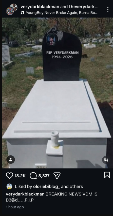 In a surprising twist, VeryDarkMan’s team later shared a post declaring that he was also dead. The announcement featured an image of a coffin alongside a plaque displaying his birth and death years, with the caption: “Breaking news. VDM is D3@d.”