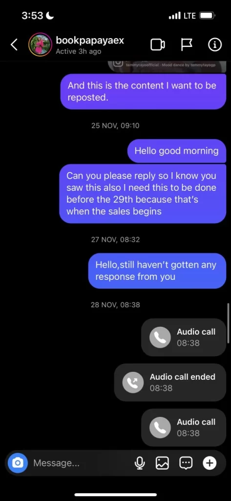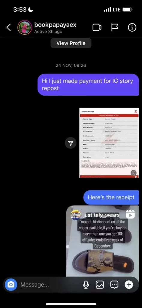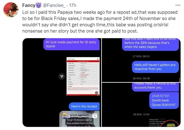 Sharing screenshots, she wrote; ”Lol so I paid this Papaya two weeks ago for a repost ad,that was supposed to be for Black Friday sales,I made the payment 24th of November so she wouldn’t say she didn’t get enough time,this babe was posting orisirisi nonsense on her story but the one she got paid to post.”