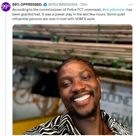 “According to the commissioner of Police FCT command, #verydarkman has been granted bail. It was a power play in the last few hours. Some quiet influential persons are now in love with VDM’S work.”