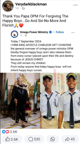 Just hours after this heartfelt request, the situation changed when Apostle Chibuzor announced on his official Facebook page that he had chosen to forgive the Happie Boys. He also lifted the curse he had set, which warned that anyone who helped them would face harsh penalties.