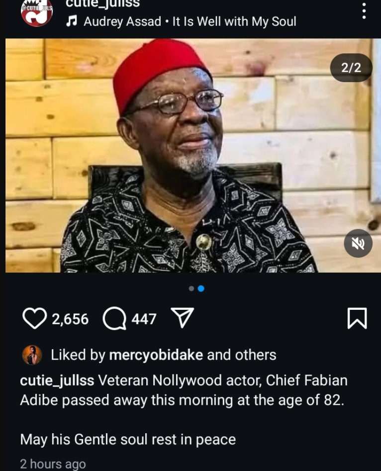 “Veteran Nollywood actor, Chief Fabian passed away this morning at the age of 82. May his gentle soul rest in peace.”