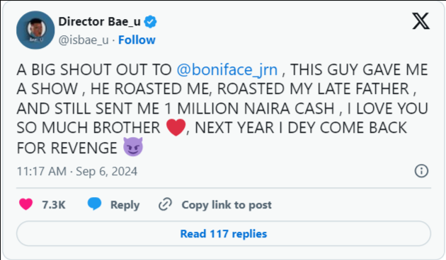 To smooth things over, Boniface reportedly gave Isbae U N1 million. Isbae U was excited about this and took to social media to show his appreciation, playfully hinting at a potential “revenge” for the previous podcast incident.