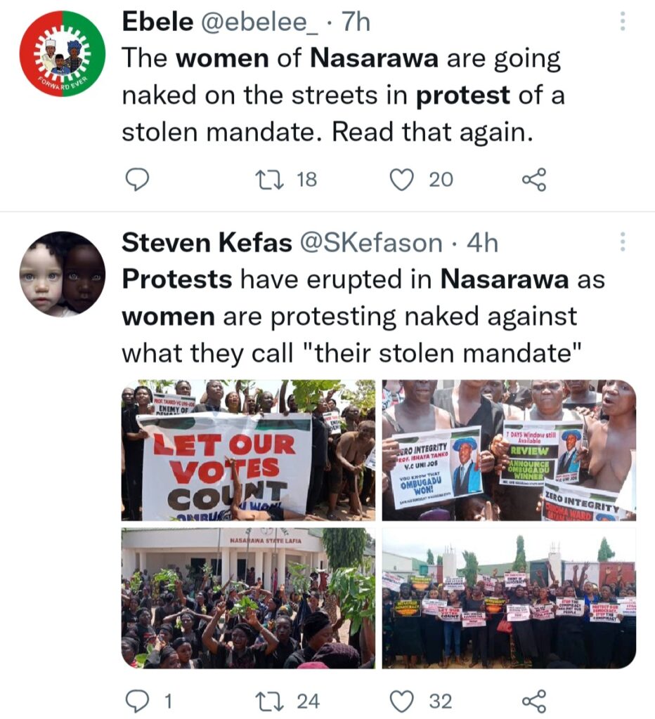 - Viral videos shared online show women protesting naked in Nasarawa State after the March 18 governorship election.