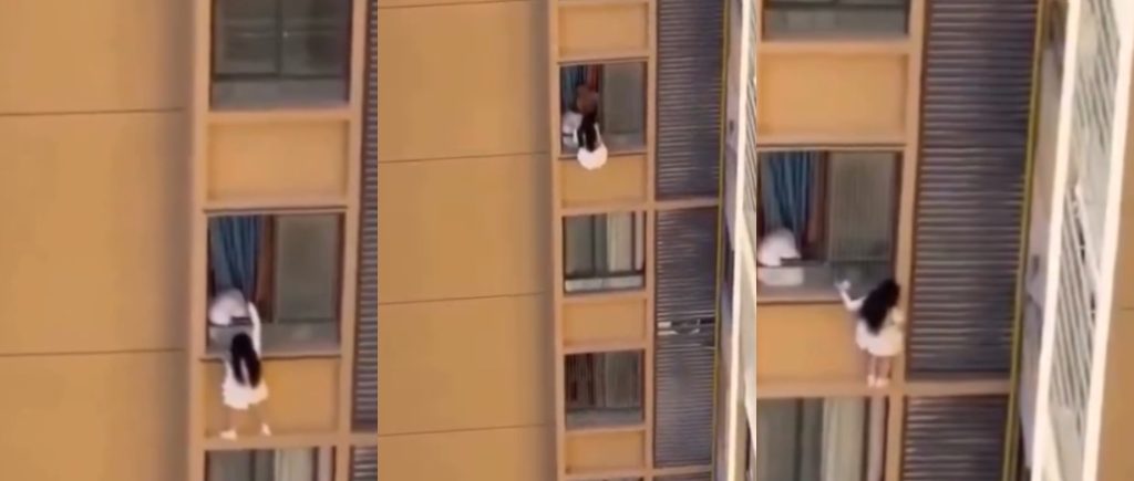 Footage shows the woman dangling from a tenth-floor balcony before using drainpipes and narrow ledges to lower herself to the floor below, eventually knocking on a neighbor’s window who pulled her to safety.