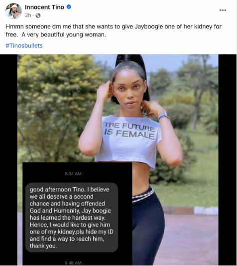 The message reads, “Good afternoon Tino. I believe we all deserve a second chance and having offended God and humanity Jay Boogie has learned the hardest way. Hence, I would like to give him one of my kidneys. Pls hide my ID and find a way to reach him. Thank you.”