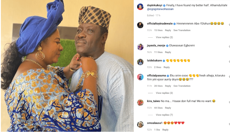 She said this under Doyin Kukoyi’s post where the actress shared a lovey-dovey photo of herself with Taiwo Hassan which a caption “Finally, I have found my better half. Alhamdulillah @ogogotaiwohassan”