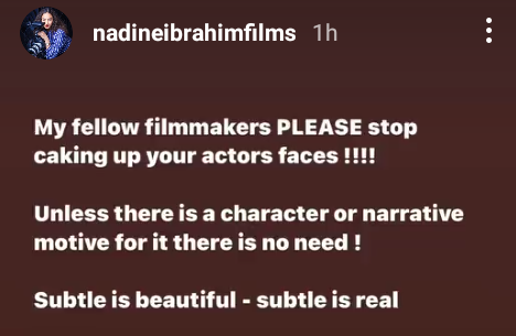 Meanwhile Nadina Ibrahim, a Nigerian filmmaker and daughter of United Nations Deputy Secretary-General, Amina Mohammed, has advised her colleagues to stop using heavy makeup on their actors.