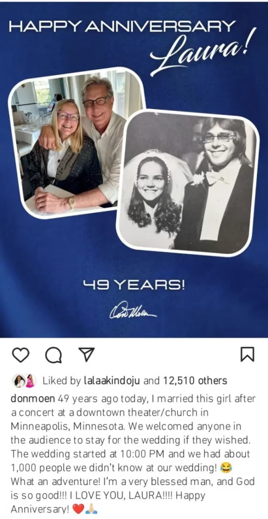 “49 years ago today, I married this girl after a concert at a downtown theatre/church in Minneapolis, Minnesota. We welcomed anyone in the audience to stay for the wedding if they wished. The wedding started at 10:00O PM and we had about 1,000 people we didn’t know at our wedding! What an adventure! I’m a very blessed man, and God is so good!!! I LOVE YOU, LAURA!!!!! Happy Anniversary!”.