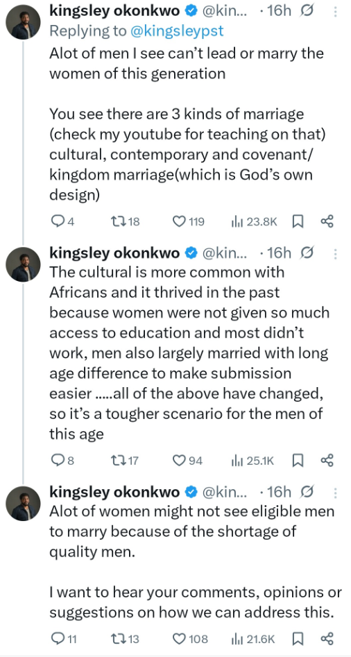 Pastor Kingsley Okonkwo has taken to X (formerly Twitter) to express concern over a perceived “crisis” involving the lack of quality men, warning it could mean many women might not find eligible men to marry.