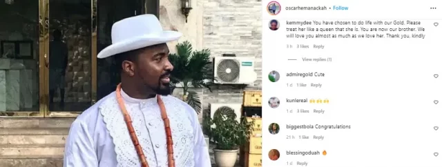 “You have chosen to do life with our Gold. Please treat her like a queen that she is. You are now our brother. We will love you almost as much as we love her. Thank you, kindly” one Kemmydee wrote on his Instagram page.