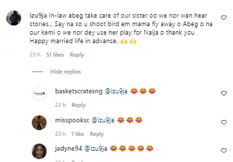 One Izu wrote “In-law abeg take care of our sister oo we nor wan hear stories… Say na so u shoot bird em mama fly away o Abeg o na our kemi o we nor dey use her play for Naija o thank you Happy married life in advance.