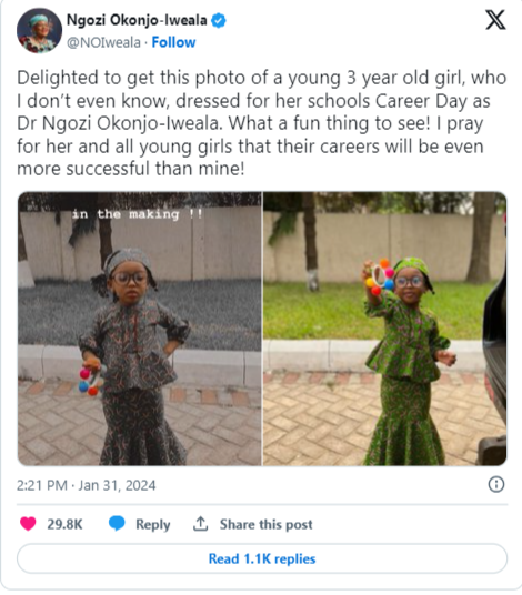 “Delighted to get this photo of a young 3-year-old girl, who I don’t even know, dressed for her school’s Career Day as Dr. Ngozi Okonjo-Iweala. What a fun thing to see! I pray for her and all young girls that their careers will be even more successful than mine!,” Ngozi Okonjo-Iweala wrote.