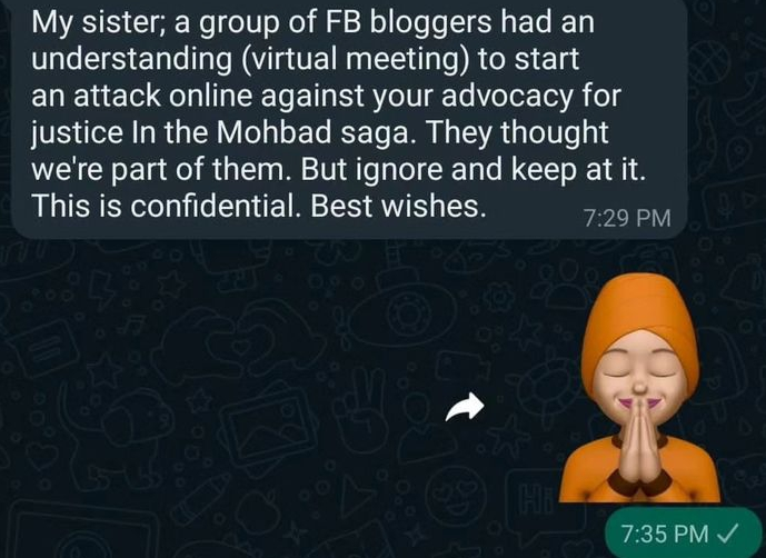 “My sister, a group of FB bloggers had an understanding (virtual meeting) to start an attack online against your advocacy for justice in the Mohbad saga. They thought we’re part of them, but ignore and keep it. This is confidential. Best wishes”.