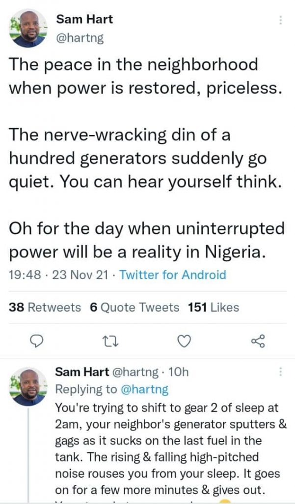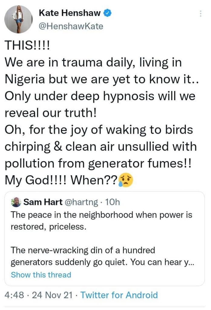 She then added that it’s for the joy of waking up to birds chirping and clean air unsullied with pollution from generator fumes asking when it will be possible for one to enjoy the serenity of the air they breath in Nigeria.