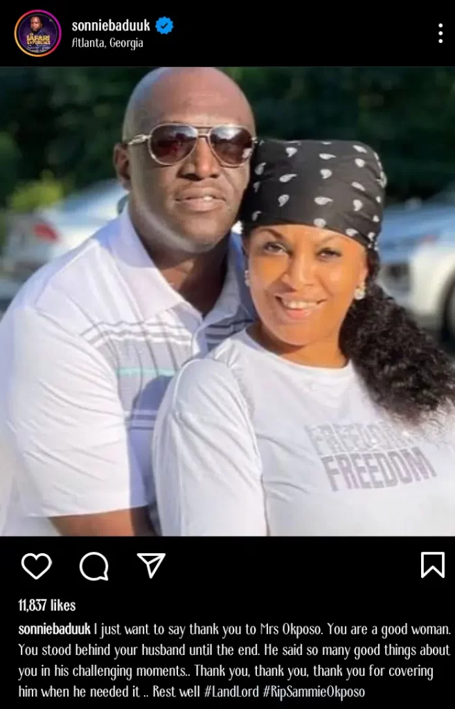 Nigerian gospel singer, Sonnie Badu, has applauded Ozzy Okposo, wife of the late gospel singer, Sammie Okposo for standing by him before his demise.