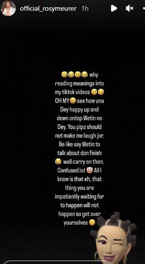 Rosy Meurer, via her Instagram story, accused haters of trying to read meanings to her harmless TikTok videos, which are meant to entertain her fans. She claimed that joblessness is the cause.