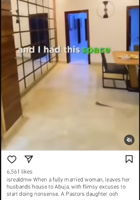 “When a fully married woman, leaves her husband’s house to Abuja, with flimsy excuses to start doing nonsense. A pastor’s daughter oooh”.