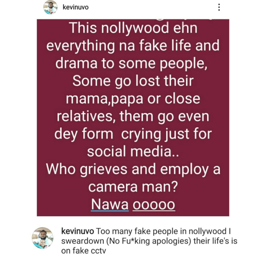 “This Nollywood ehn everything na fake life and drama to some people. Some go lost their mama, papa or close relatives, them go even dey form crying just for social media. Who grieves and employ a camera man? Nawa ooo. Too many fake people in Nollywood I swear down”. He wrote.