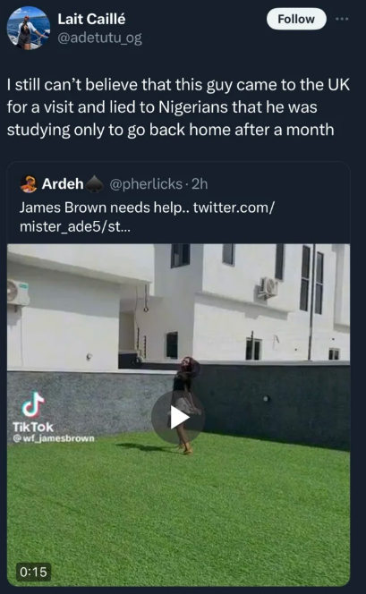 James Brown, a transvestite who claimed to be studying in the UK, has been revealed by a Nigerian woman living in the UK.