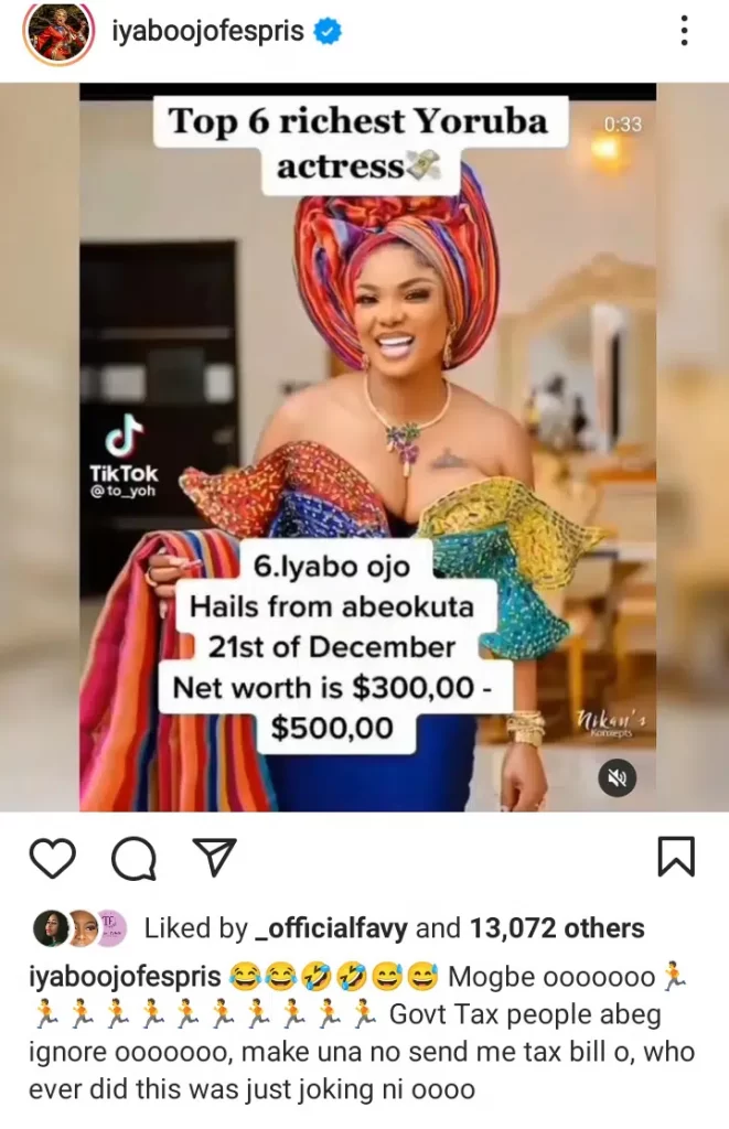 Apparently, a video had been making the rounds on social media which listed out the top six wealthiest Nollywood Yoruba actresses placing Iyabo Ojo as the sixth wealthiest with an estimated net worth of 300-500k dollars.