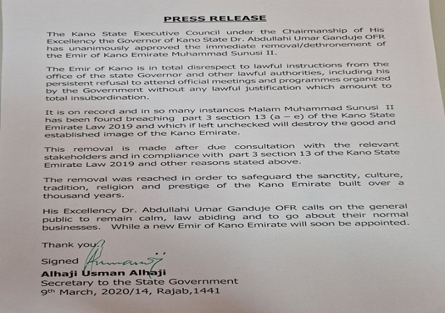 In a statement released this afternoon, the Secretary to the State government, Usman Alhaji, said the Emir has consistently refused to abide by instructions given to him by the state government and has persistently refused to attend official meetings and programmes organized by the government without any lawful justification which amount to total insubordination.