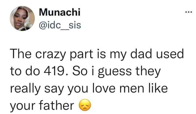 In a seemingly unprovoked yet thoughtless tweet, the lady said she loves men who do 419 because her Father used to be an active 419’er.
