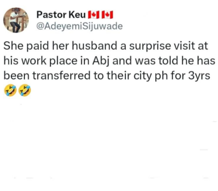 - A Nigerian wife who traveled to Abuja to surprise her husband at work was shocked to discover he had been transferred back to their home city three years ago a fact he had kept hidden from her.