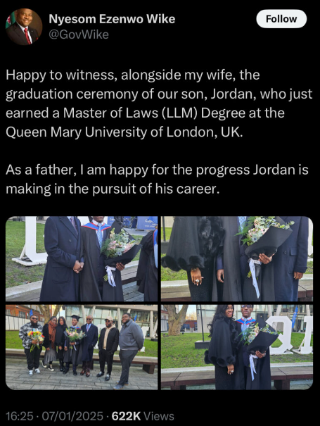 Nyesom Wike, the Minister of Nigeria’s Federal Capital Territory, is very proud of his son, Jordan, who has just earned a Master of Laws (LLM) degree from Queen Mary University of London.